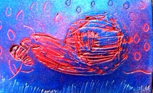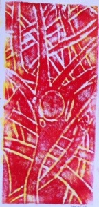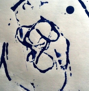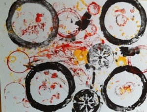 A printing storm hit Hay Loft Studio. Four kids, plenty of ink (water based of course), paper, rollers, bottle caps, string, styrofoam, corks, cookie cutters, matchbox cars, t.p. rolls, leaves, pencils, even old tractor bits, two tired dogs and me. Curiosity urged one student to count all the prints. I believe there were 46 in all! Whew! Thanks to the students for their enthusiasm and great inspirations. I neglected to take photos but here’s what I scrounged up with the help of parents:
