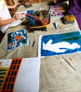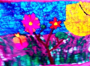 Crayon batik in the Hayloft this week. A lovely group of girls joined me the last two days to try their hands at some batiking. We sketched our ideas and highlighted them with dark marker. This allowed us to see what we needed to paint through the fabric we were using to batik. Next, we sandwiched cardboard under our drawings and cotton fabric over, stretching the fabric like a canvas and securing with masking tape.