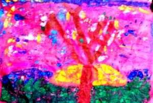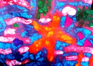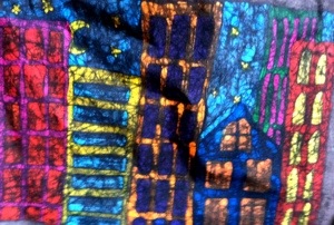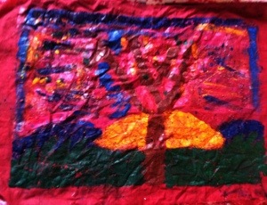 It certainly isn’t like painting with paint. The wax cools quickly on the brush so there’s a lot more dipping. When done remove the cloth from cardboard set up and scrunch it up a few times. Over a trash can is a good idea! The next step is to dye the fabric. We used Rit liquid dye. Mix with hot water but don’t dip the crayon painting in yet. Avoid the drooly melted mess and let the dye cool! Submerge the painted fabric in the dye for at least 20 minutes. Pull out and squeeze. Latex gloves are handy. Lay the pieces flat on layers of newspaper and cover with another couple layers of newspaper.