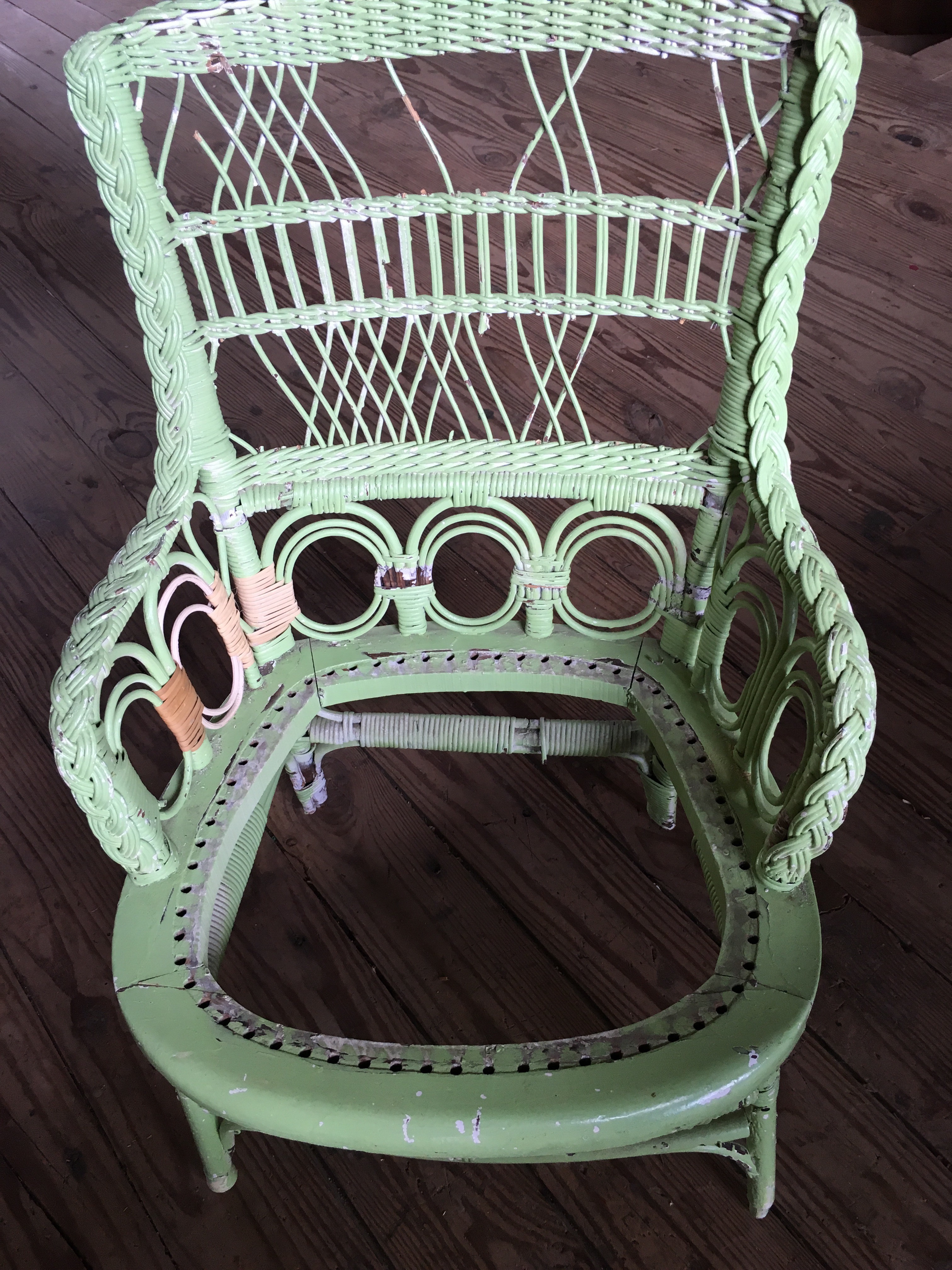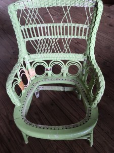 Our local Historical Commission asked me to demonstrate chair caning at their fall festival and to promote the festival the local newspaper wrote an article about it. The combination of festival exposure and publicity from the paper has created a flurry of business for chair caning at Hayloft Studio. Unfortunately, I did not take any pictures. I did work in the child’s wicker chair while I was at the festival. I am ready to paint it (the paint on it now is not of any historical value) and then repair the seat. Here are some photos.