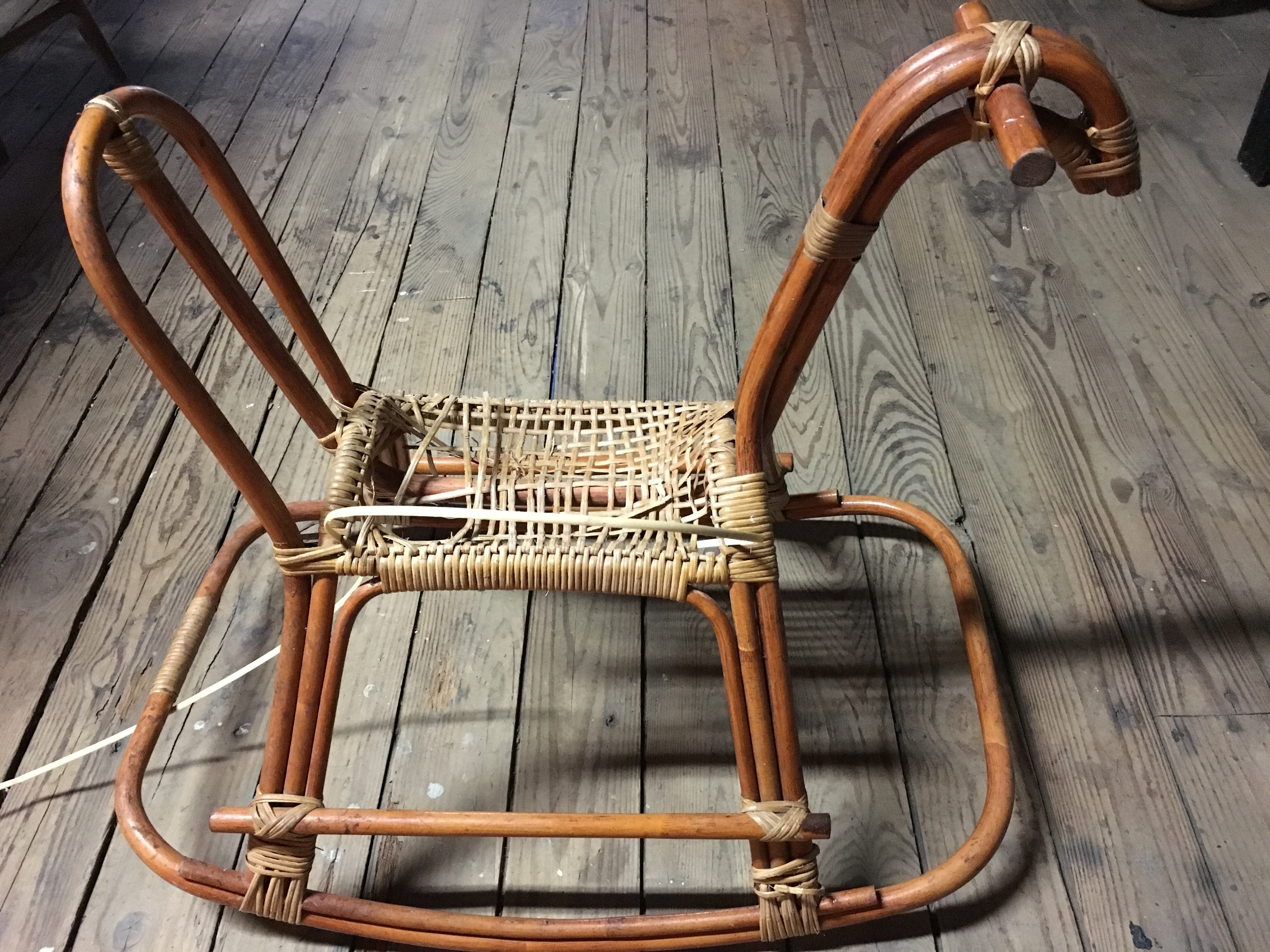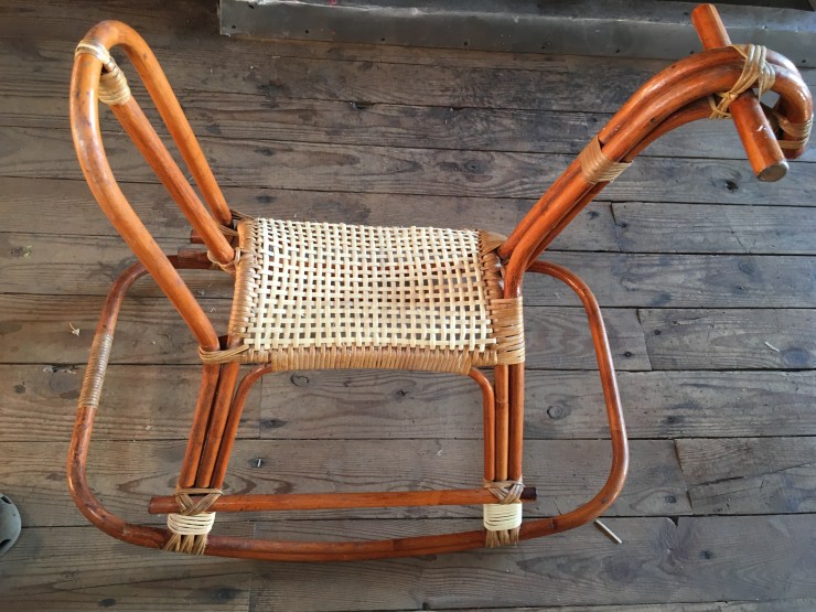 This sweet little rocking horse came through the studio a few weeks ago with a broken saddle. It’s dated somewhere around the 1950’s with a rattan frame and caned seat.
