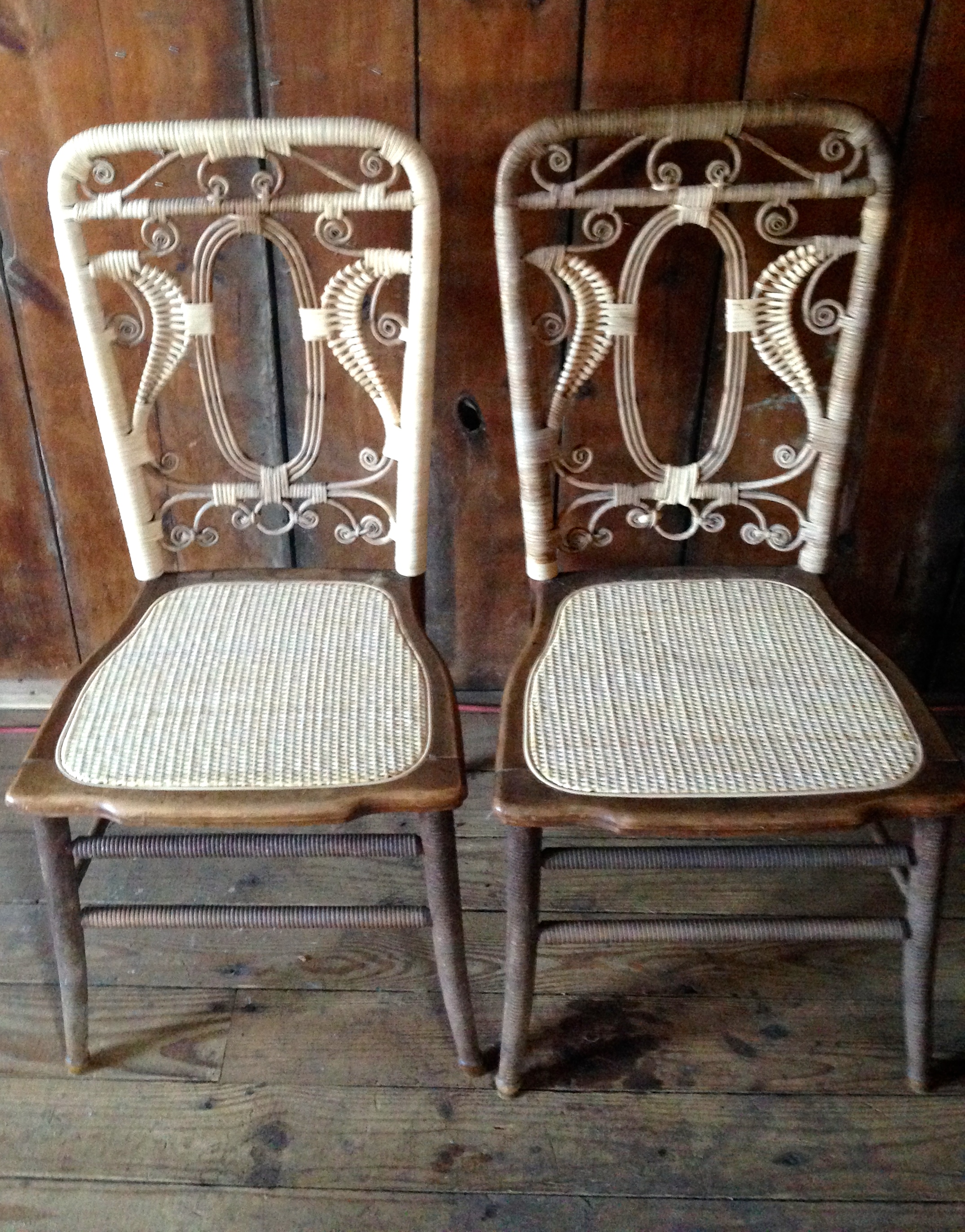 Have a beloved chair, rocker or stool that needs re-caning?  Old wicker piece that’s come unraveled? Get it repaired at Hayloft Studio.  The timeless skills of chair caning and wicker repair have been passed on to me by my mother.  Thanks Mom! Combine that with my years of experience preserving and restoring historical finishes and your family heirloom is in loving respectful hands at Hayloft Studio.    The going rates can be found on the chair cane pricing page, but it is always best to bring the piece right to me for a clearer estimate.